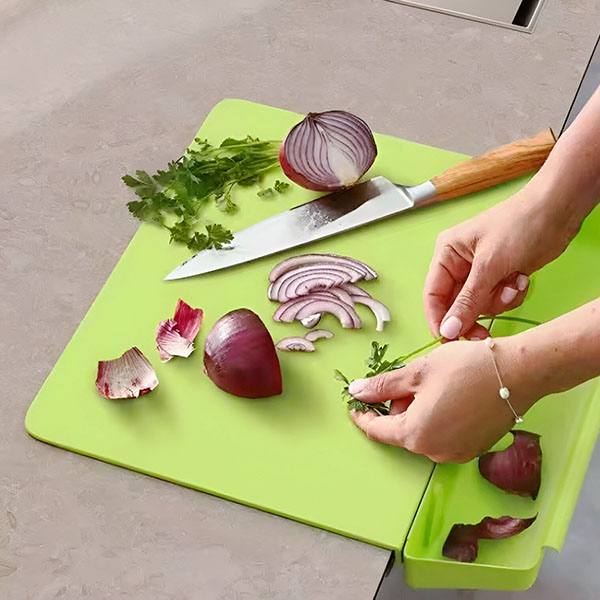 Дъска за рязане с отделен контейнер за органични отпадъци. Практично решение за подреден кухненски плот.