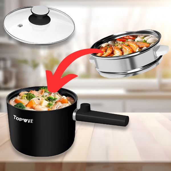 Капацитет от 1.5L побира рамен, хотпот или зеленчуци — идеален за 1–2 души в тесни пространства.