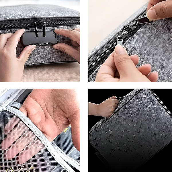 Притеснявате се за безопасността на важните си документи и ценности? Тази водоустойчива чанта е оборудвана със сигурно кодово заключване, което гарантира, че Вашите документи, пари и бижута ще останат недостъпни за други хора.