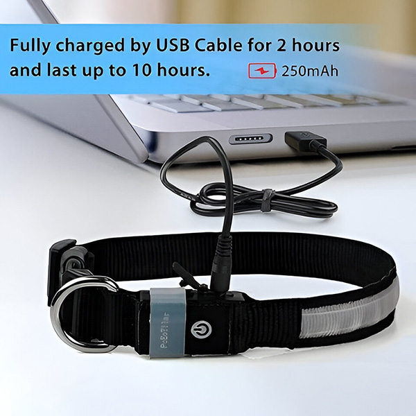 Осветлете разходките на домашния си любимец в тъмното. Този светещ нашийник за кучета прави всяка разходка безопасна, като прави кучето ви видимо по време на нощните разходки. Ярките LED светлини предлагат 360-градусова видимост, като предпазват домашния ви любимец от преминаващите превозни средства.