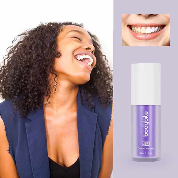 V34 използва технология за цветова корекция, за да подобри видимо яркостта на вашата усмивка. Тъй като лилавото е допълващият цвят на жълтото, формулата помага да се балансират нежеланите жълти тонове за по-равномерен и сияен вид. Резултатът е мигновено по-свежа усмивка — без агресивни процедури или сложни стъпки.